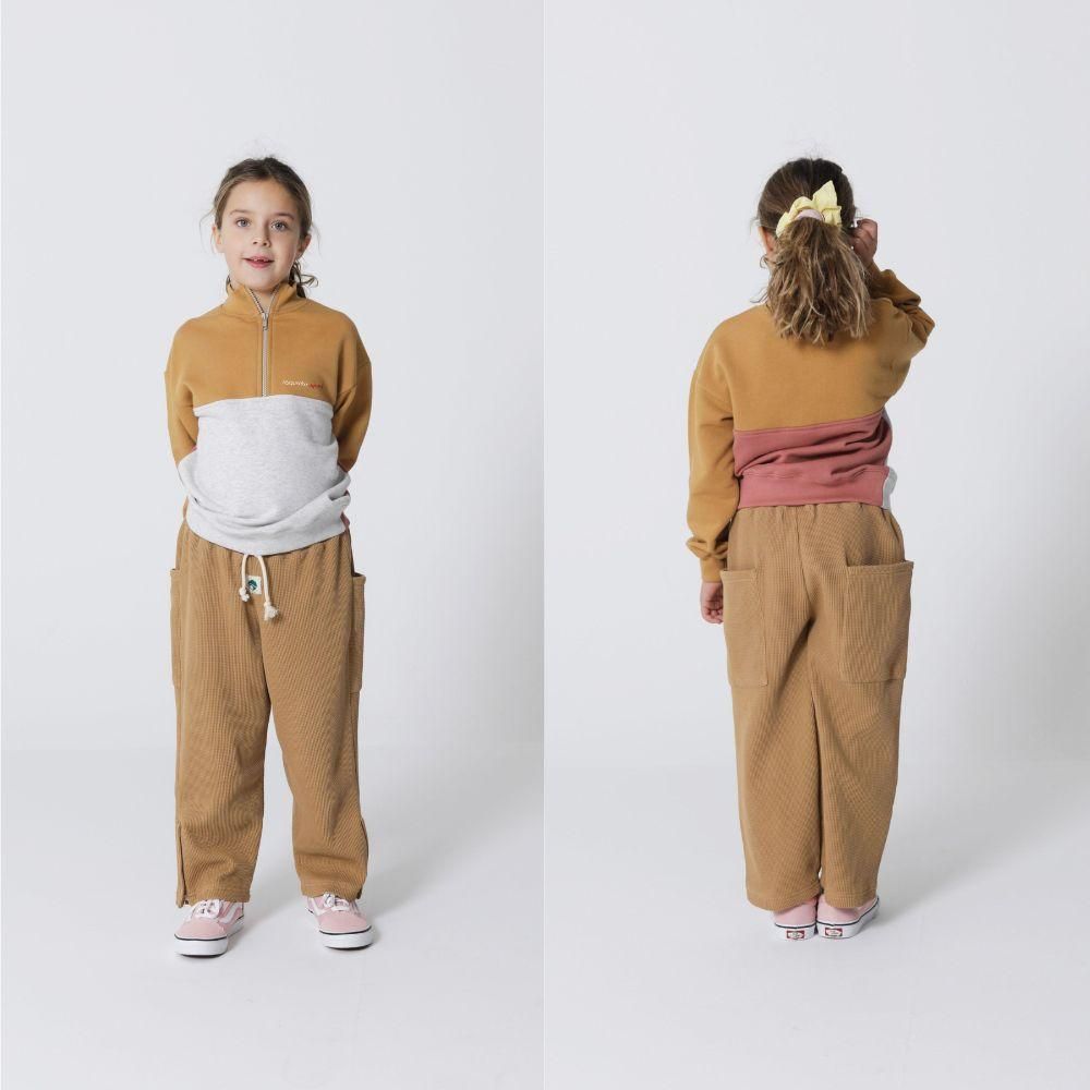 大胆なアシンメトリーのブロッキングとスタンドカラーのプルオーバースウェット。