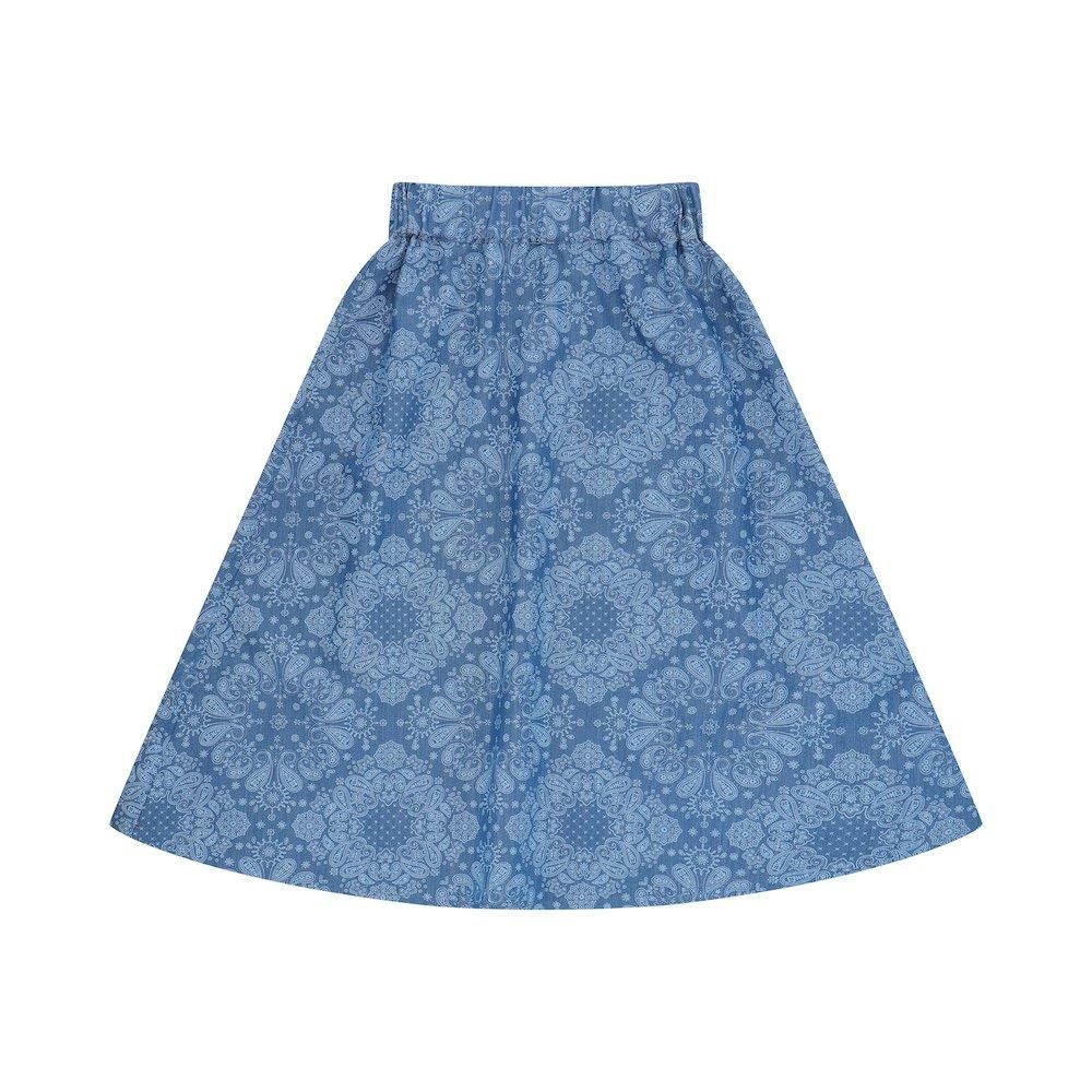 鮮やかなブルーのペイズリー柄が華やかさをプラスしつつ、落ち着いた雰囲気を演出されたロングスカート。
