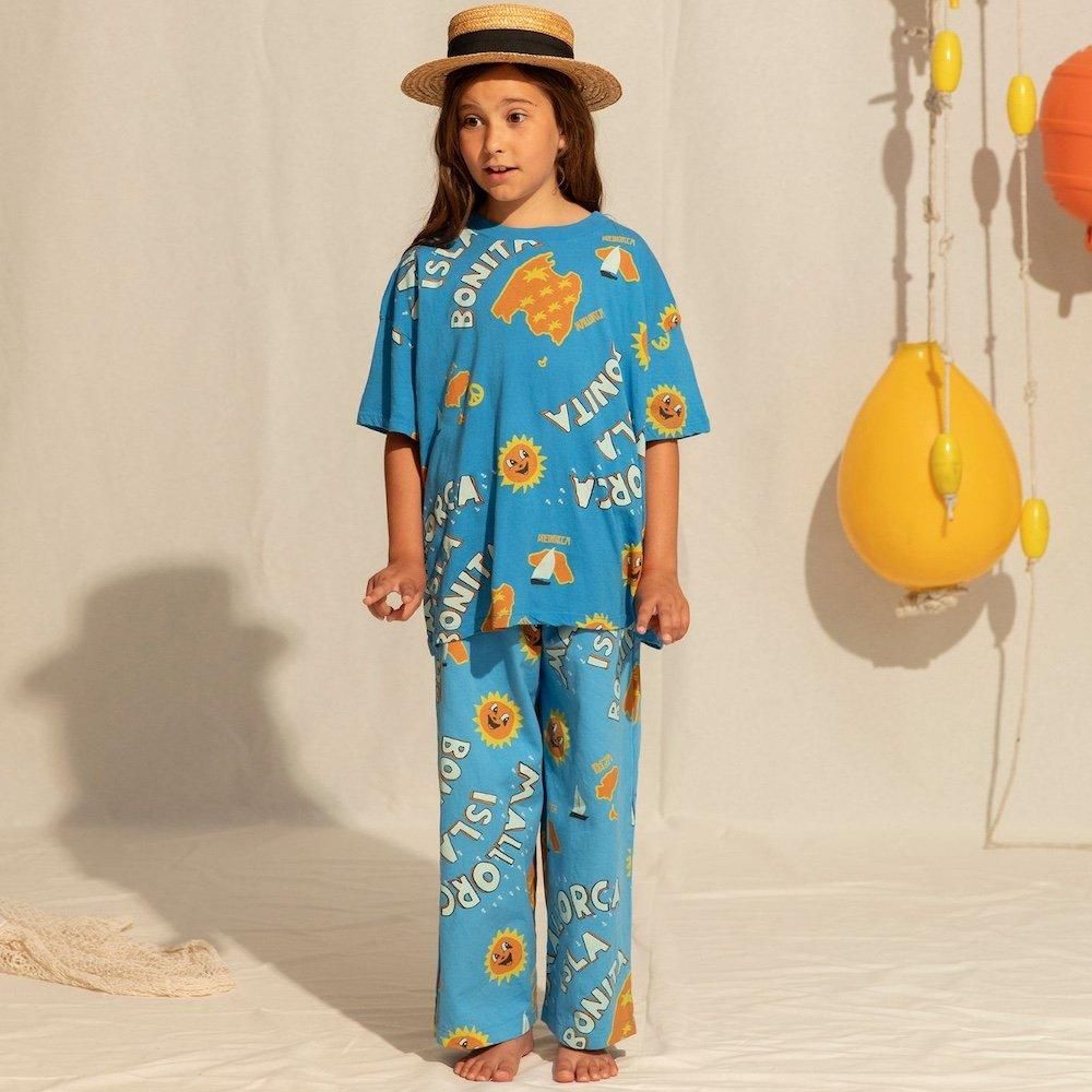 ブルーベースにオレンジのイラストが映える、自然の温かみを感じるデザインです。オールオーバープリントながら、どこか抜け感があってリラックスした印象に。